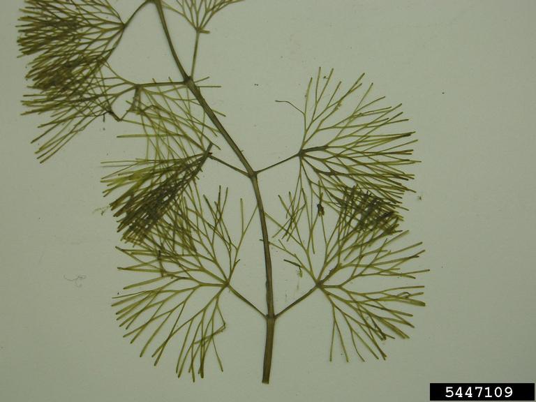 Leaves: Individual leaves have thin vein-like structures in a half-moon shape. Underwater leaves are divided into fine branches, resulting in a feathery fan-like appearance. Leaves are about 5 cm across. There are also a few small, floating, linear-elliptic leaves with entire margins and a basal notch. They are 6-20 mm long.